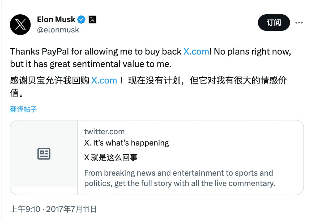 伊隆·马斯克发推庆祝拿回 X.com 域名|图片来源:Twitter