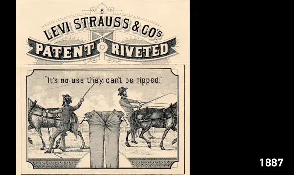 为了证明牛仔裤的坚韧,斯特劳是设计了一场让两匹马拉扯牛仔裤的表演,双马皮牌也由此成为李维斯的标志|图片来源:levistrauss