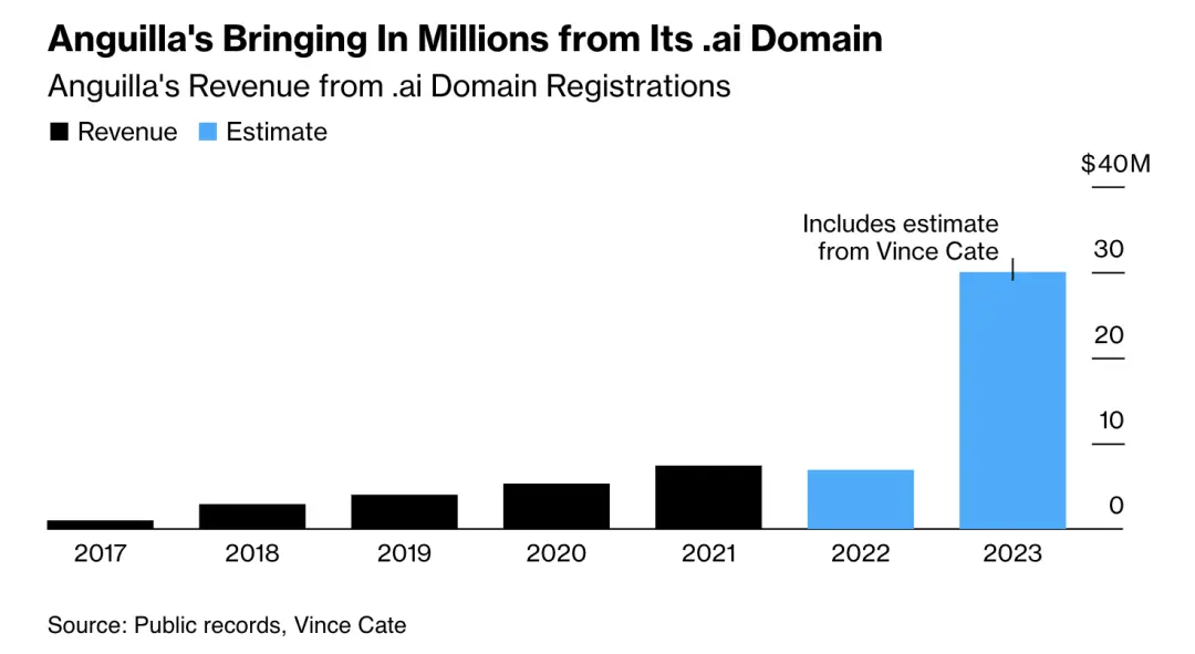 据凯特估计,安圭拉 2023 年从域名注册中获取的收益,将达到 2500 万至 3000 万美元之间。仅仅在两年前,这个数字还只有 830 万美元。这虽然与 AI 行业动辄几十亿美元的资金无法相比,但要知道,安圭拉仅仅是一个面积 91 平方公里、人口不足 2 万的小岛;疫情期间,其支柱产业旅游业还受到了影响。