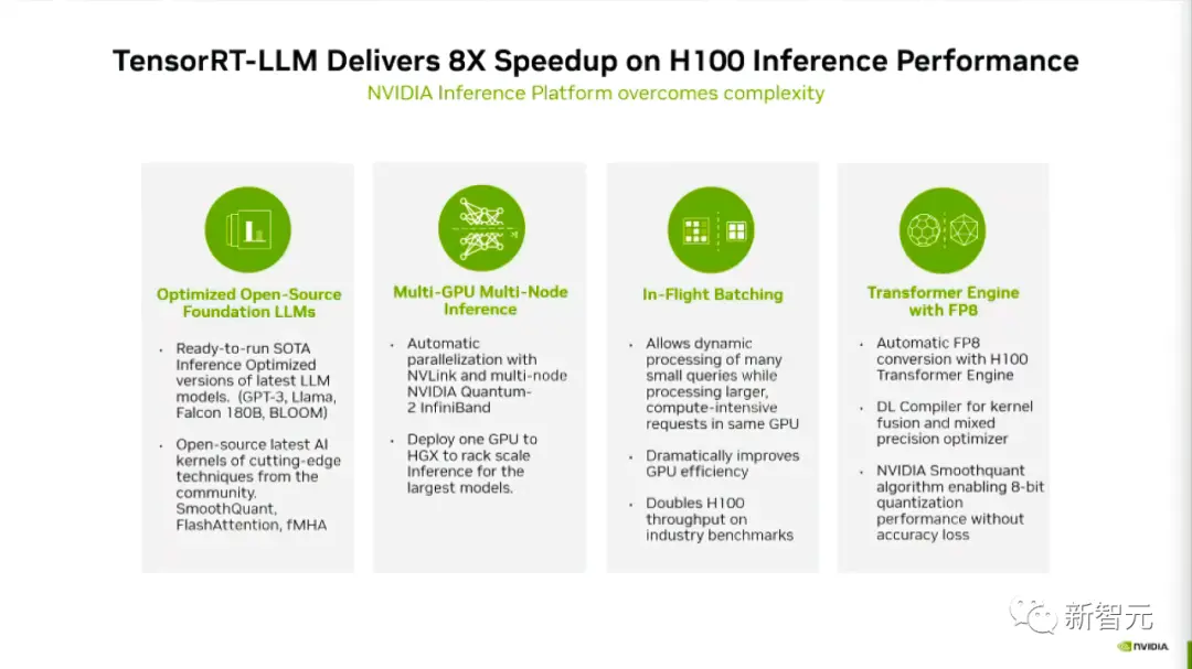 最后,TensorRT-LLM经过优化,可以利用H100 Transformer Engine来降低模型推理时的内存占用和延迟。