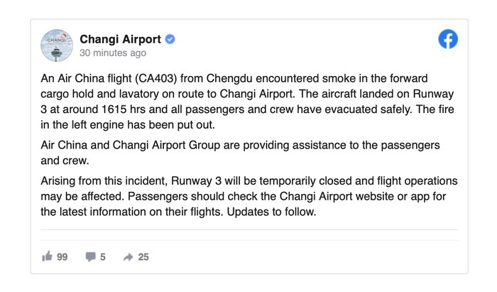 新加坡樟宜机场通过其Facebook账号发布通报称,这架于上午11时05分从天府国际机场起飞的CA403航班在飞往新加坡樟宜机场的途中,其前货舱和卫生间突然出现烟雾。下午4时15分左右,该航班降落在樟宜机场3号跑道,所有乘客和机组人员均已安全撤离。左侧发动机的火现已被扑灭。