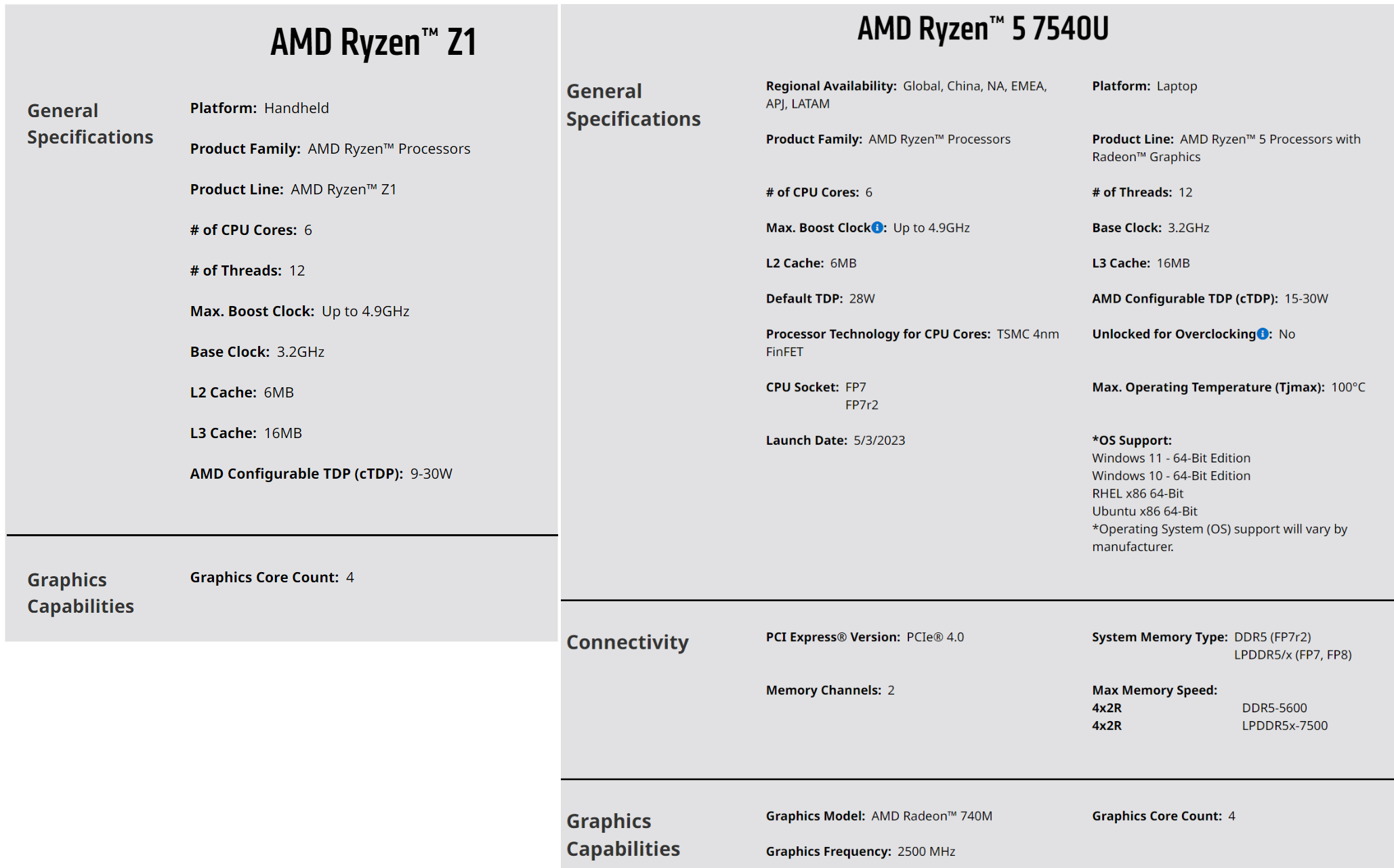 值得一提的是,AMD专为掌机设计的锐龙Z1系列,也被怀疑是大小核设计,毕竟规格和锐龙5 7540U太像了。