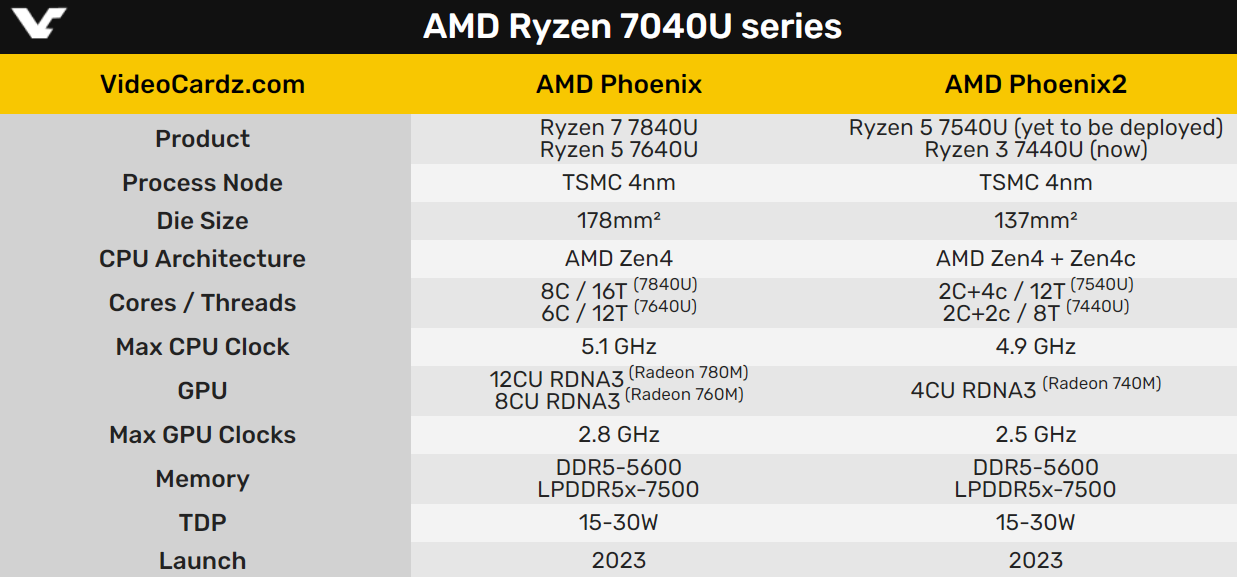 锐龙7 7840U、锐龙5 7640U则是最多八个Zen4 CPU核心、12个GPU核心,总面积178平方毫米,二者相差了23%。