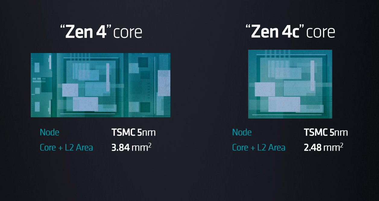 AMD官方明确表示,5nm工艺下,Zen4核心加二级缓存是3.84平方毫米,Zen4c核心加二级缓存则是2.48平方毫米,缩小了足足35%。