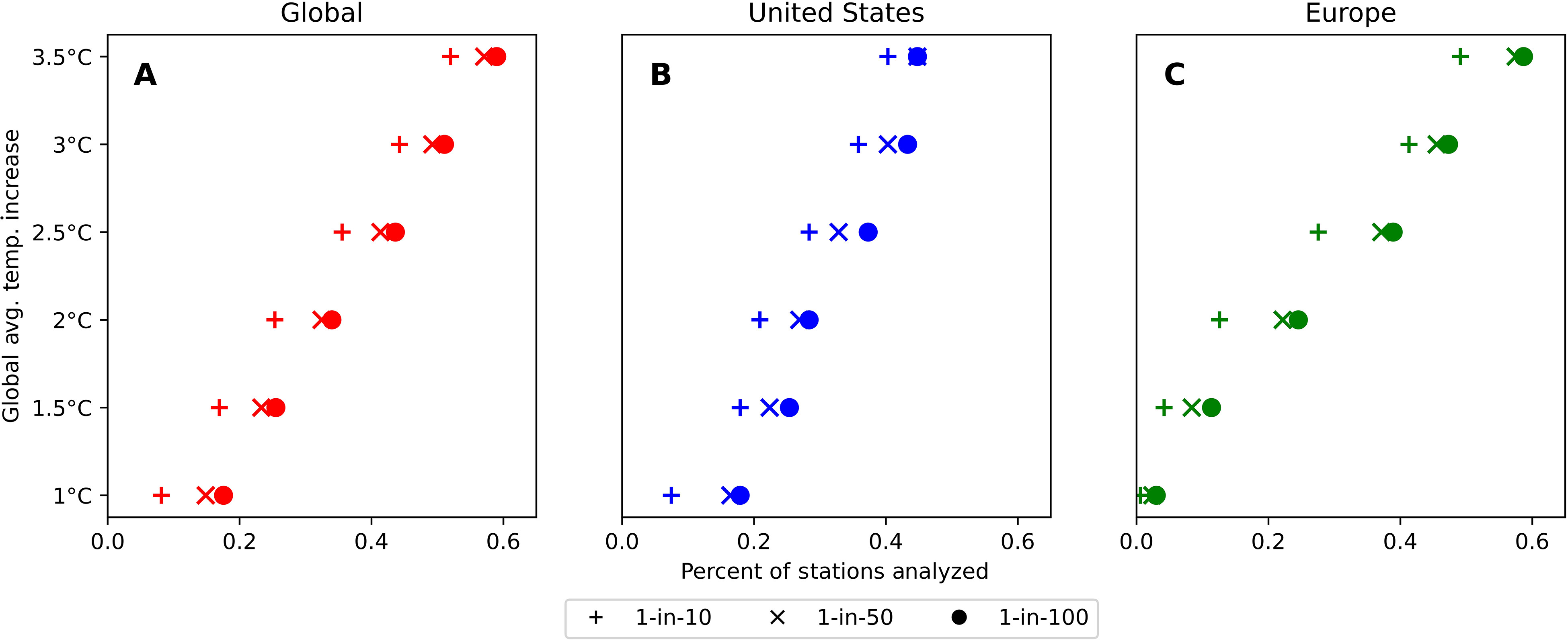 例如,在全球变暖1摄氏度的情况下,欧洲只有3%的气象站可能在100年内有1次超过31摄氏度的阈值。如果全球变暖2摄氏度,25%的气象站可能会超过这一阈值。在美国,在全球变暖1摄氏度的情况下,20%的气象站可能在100年内不止一次突破这一阈值,而当全球变暖2摄氏度,这一比例将升至28%。