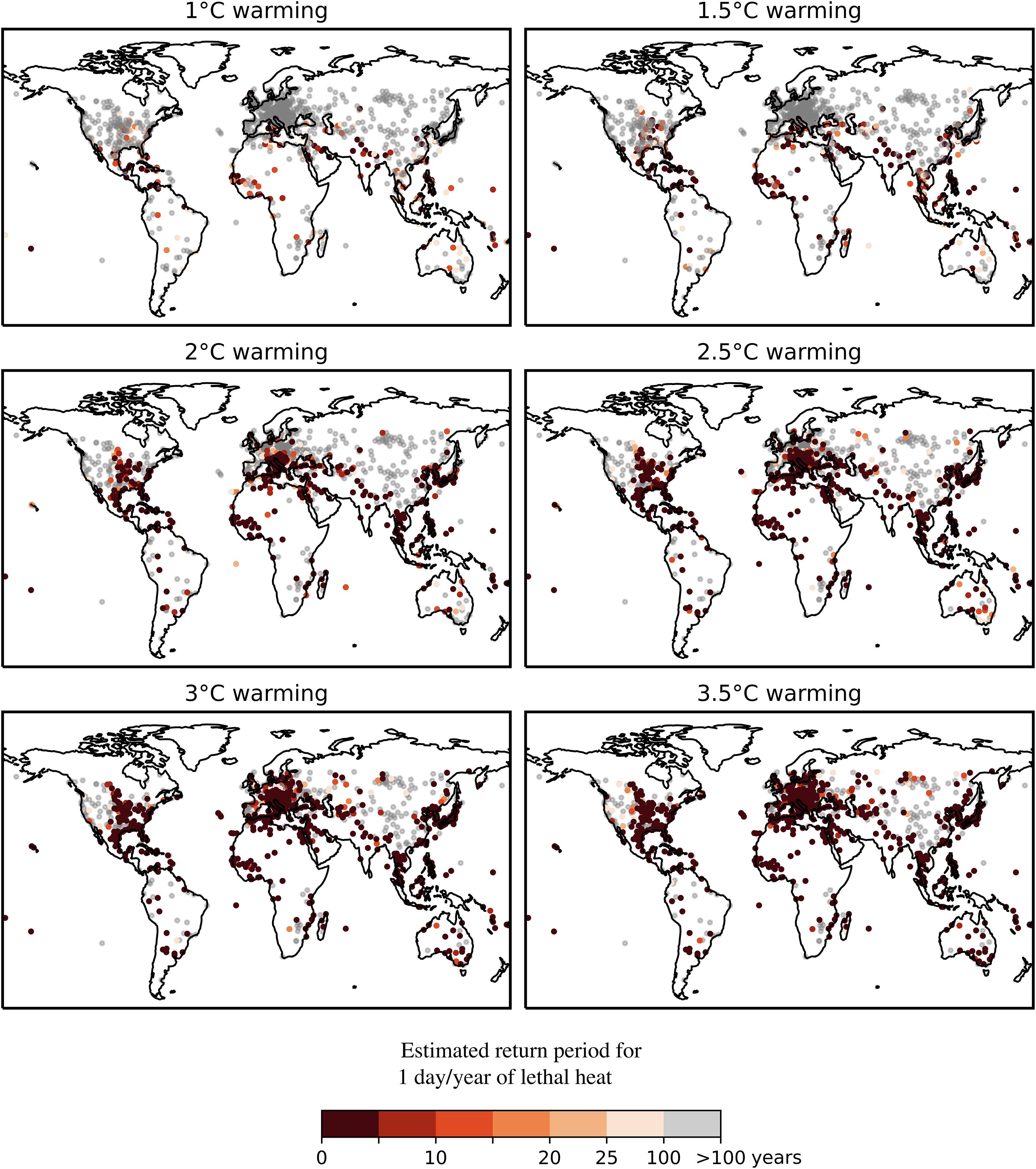Powis和同事使用气象站和气候模型的数据,根据31摄氏度湿球温度的发现,研究了目前世界上哪些地方可能出现这种情况,以及随着气候变暖,这种情况将如何变化。