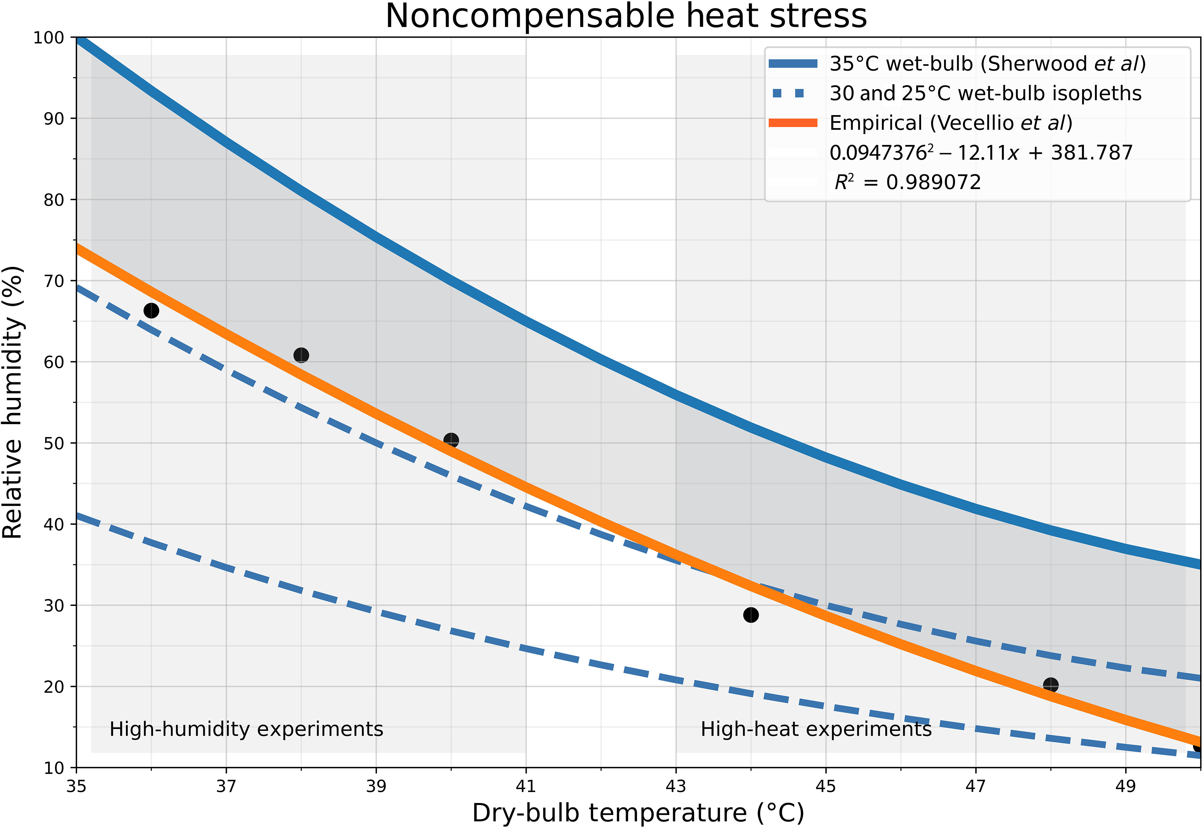 根据理论,用湿布覆盖的温度计测量的温度超过35摄氏度时即达到了人类生存的极限。这是所谓的湿球温度。它反映了这样一个事实,即湿度会影响人们通过出汗保持凉爽的能力。在这个湿球读数下,人们不能再自然地控制核心体温,如果不采取行动以其他方式保持凉爽,会引发潜在的致命风险。