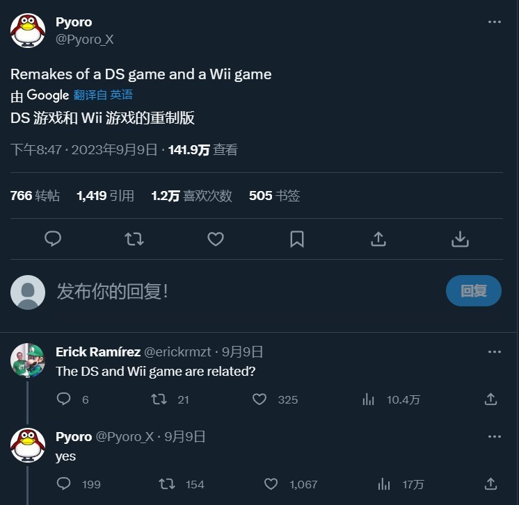 Pyoro还透露将有两款NDS和Wii平台游戏的重制版在本次直面会上亮相。这些游戏将重新制作并优化原版的内容,以适应当今的游戏平台和玩家需求。更令人兴奋的是,据Pyoro透露,这两款重制版游戏之间可能存在某种联系,有玩家猜测这两款重制版很有可能是马里奥和塞尔达传说系列作品。