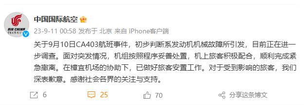9月11日消息,今日凌晨,中国国际航空官微发布“关于9月10日CA403航班事件”通报,官方称,初步判断系发动机机械故障所引发,目前正在进一步调查。面对突发情况,机组按照程序妥善处置,机上旅客积极配合,顺利完成紧急撤离,在樟宜机场的协助下,已做好旅客安置工作,对于受到影响的旅客,我们深表歉意。