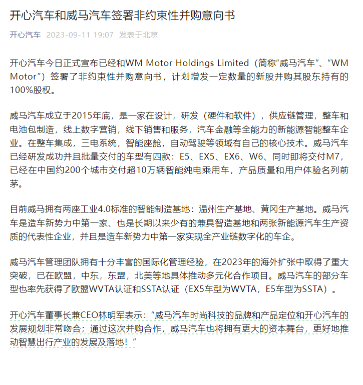 开心汽车宣布,已经和WM Motor HoldingsLimited (简称“威马汽车”、“WM Motor”) 签署了非约束性并购意向书,计划增发一定数量的新股并购其股东持有的100%股权。