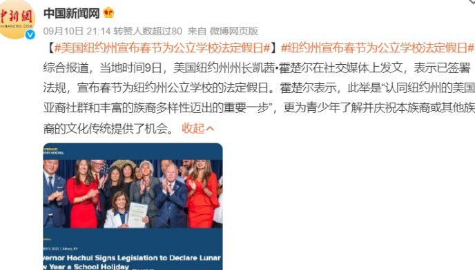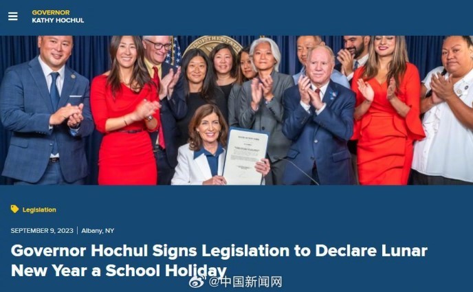 据中国新闻网报道,当地时间9日,美国纽约州州长凯茜•霍楚尔在社交媒体上发文,表示已签署法规,宣布春节为纽约州公立学校的法定假日。