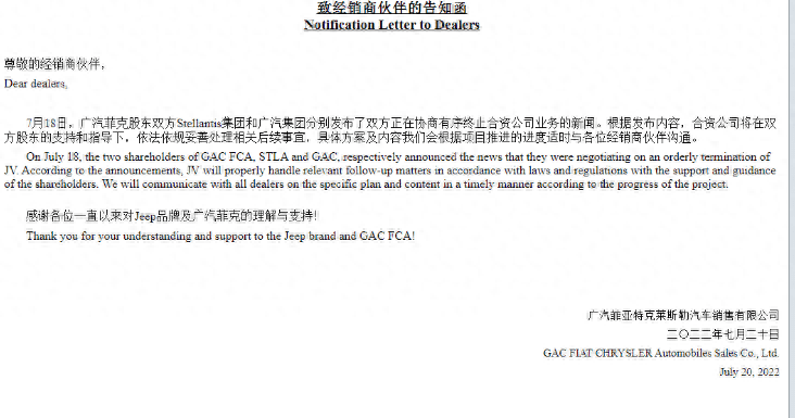 2022年12月31日,克莱斯勒(中国)汽车销售有限公司给经销商发送了一份邮件,称“我司与贵司签署的Jeep品牌进口经销商协议将于2023年12月31日到期……考虑到广菲克的破产申请,根据经销商协议14.2(1)(iv)款的规定,我司可能在上述到期日之前相应提前终止经销商协议;在经销商协议有效期内,我司将公平对待所有经销商,但由于中国汽车认证要求的变化,我司预计从2023年6月30日起将不再进口和供应可满足中国合规要求的车辆”。