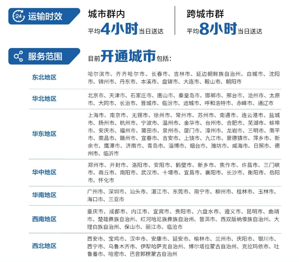 高铁城市群内平均4小时,当日送达;跨城市群平均8小时,当日送达。