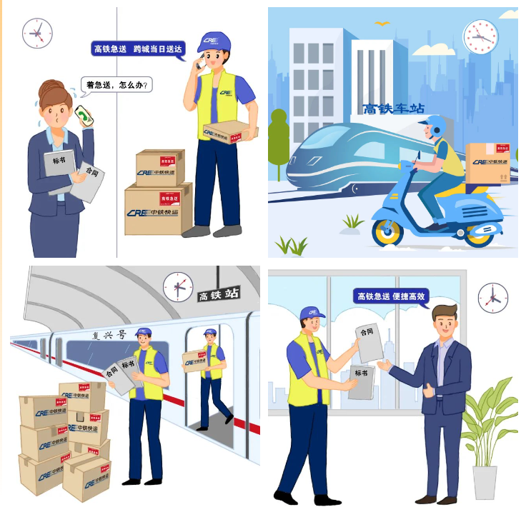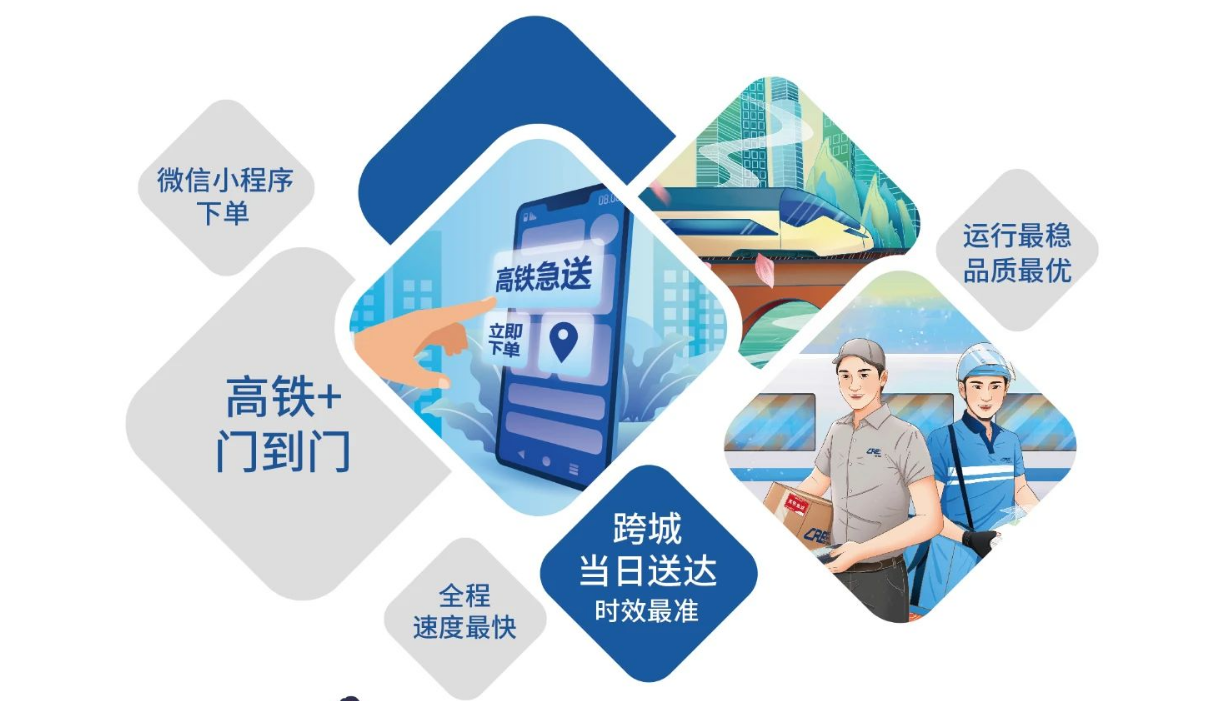 “高铁急送”采用即收、即运、即送方式,在国内主要城市间,以高铁载客动车组列车为主要干线运力,高效衔接发到两端同城取送货骑手,实现“足不出户、线上下单、门到门当日送达”。