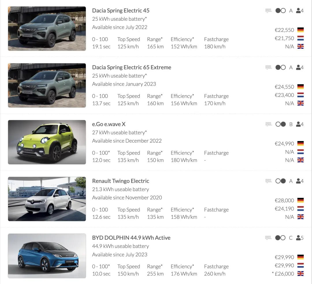 首先欧洲电动车的价格确实不菲,在Electric Vehicle Database网站上选择价格从低到高排序,排在榜首最便宜的电动车是雷诺的达契亚Spring,售价2.1万欧[4]。在国内,这款车型的原版,东风纳米Box起售价4.87万元,价差3-4倍。