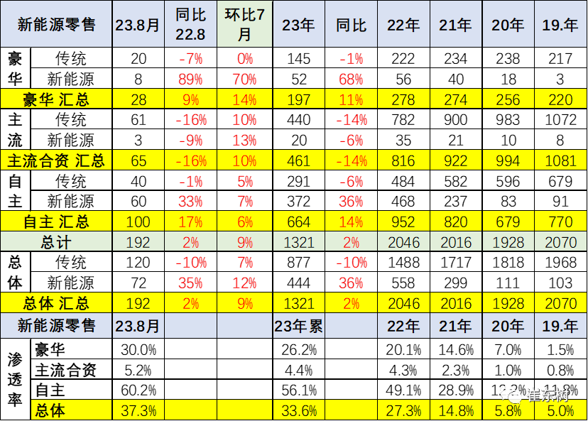 2023年8月,自主品牌中的新能源车渗透率60.2%;豪华车中的新能源车渗透率30%;而主流合资品牌中的新能源车渗透率仅有5.2%。