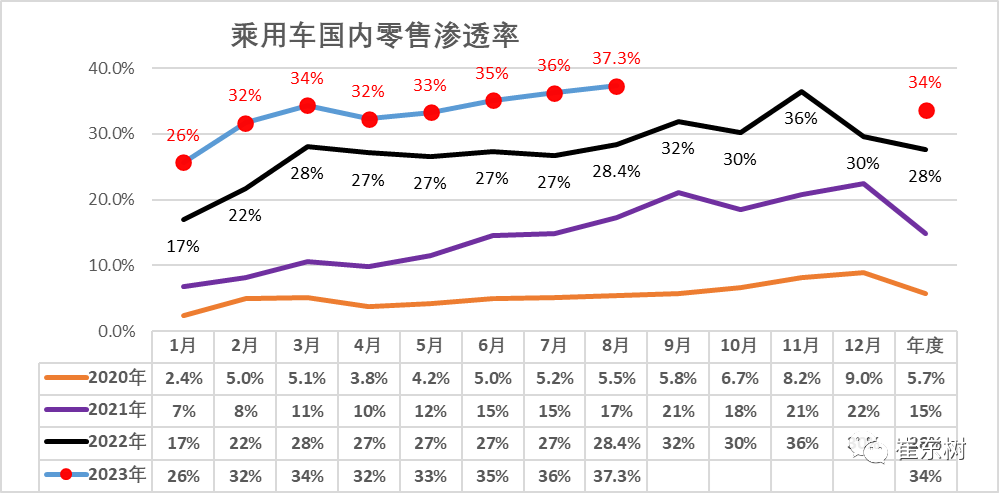 今天乘联会秘书长崔东树撰文称,8月新能源车国内零售渗透率已达37.3%,自主品牌中的新能源车渗透率更是突破60%。具体数据方面,8月新能源车市场零售71.6万辆,同比增长35%,环比增12%。8月新能源车国内零售渗透率37.3%,较去年同期28.4%的渗透率提升8.9个百分点。
