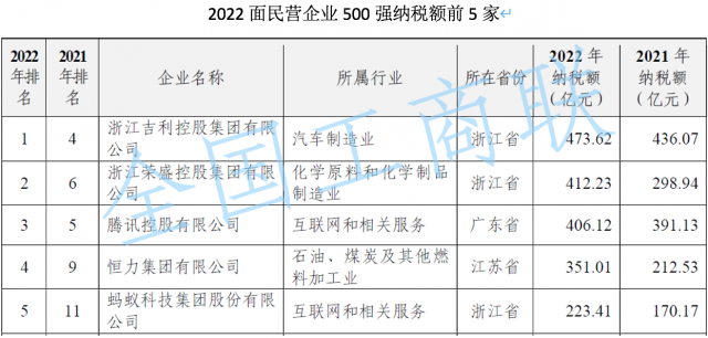 在税收、社会责任投入等方面,民企也在参与支持社会发展。《报告》显示,2022年,纳税额前五位的500强企业分别是浙江吉利、浙江荣盛司、腾讯、恒力集团、蚂蚁集团,五家企业的纳税额均超过了200亿元。其中,蚂蚁集团2022年纳税额较2021年增加了53亿元,排名较2021年上升了6位。