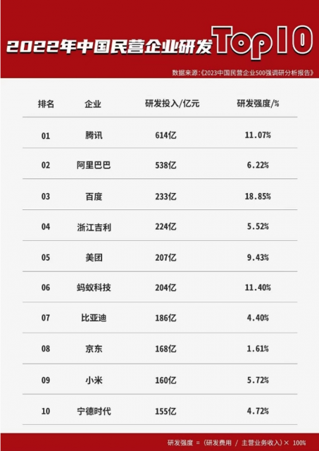昨日,全国工商联发布《2023中国民营企业500强调研分析报告》,报告显示,民营企业500强持续加大研发投入力度,研发投入金额排名前十的企业分别为腾讯、阿里巴巴、百度、浙江吉利、美团、蚂蚁科技、比亚迪、京东、小米、宁德时代。其中,百度、蚂蚁集团、腾讯研发强度超过10%,位居民营企业研发费用十强中的前三位。