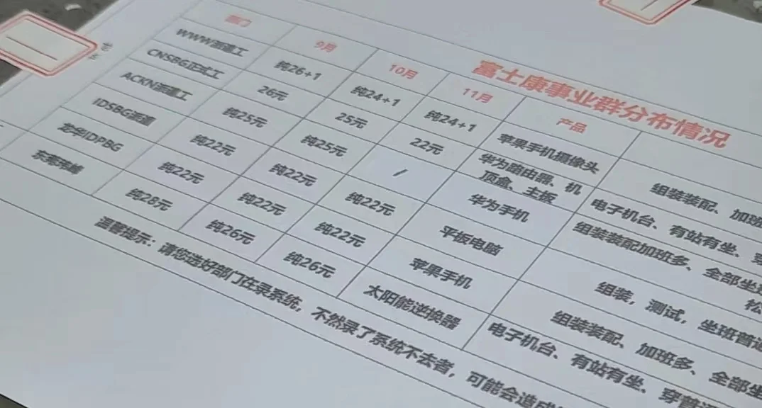 与此同时,记者从多名人力中介了解到,富士康龙华做华为等手机品牌订单的富士康ACKN部门(现为FIH部门)还在高价招人,9月12日公布的小时工时薪26元。除做手机摄像头、需穿防尘服的WWW事业群外,这是富士康龙华目前最高薪招人的部门。