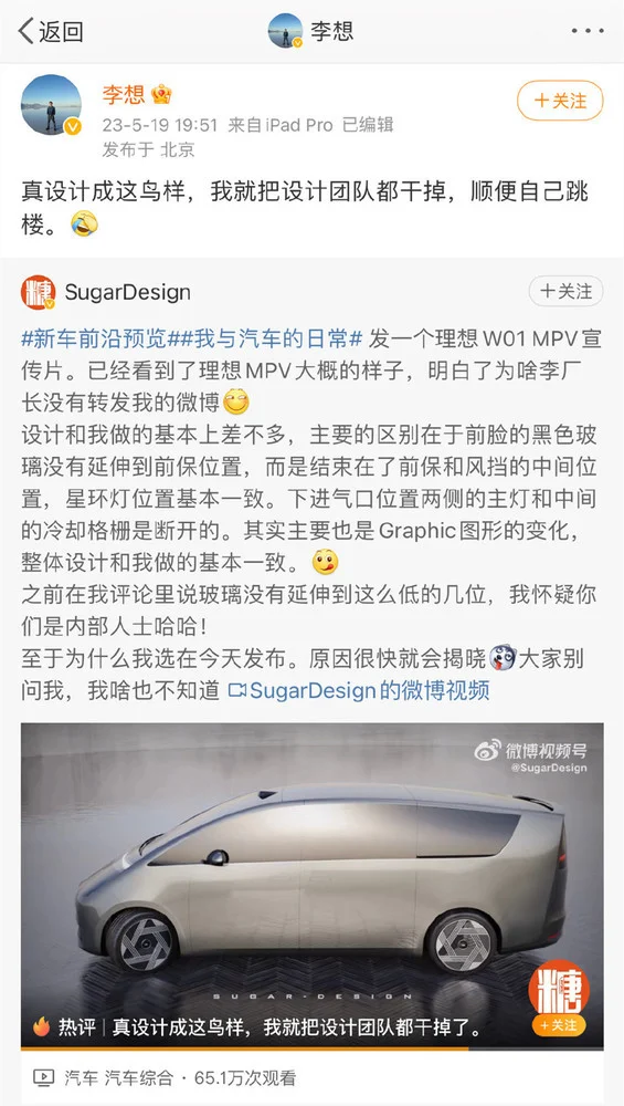 赵长江此时发这些图片,显然意在暗指理想MEGA。二者都采用了流线型的造型,与丰田的经典车型“子弹头”(普瑞维亚)较为类似。而就在今年5月份时,有博主曾制作了理想MPV的渲染图,但是被理想汽车CEO李想在线“辟谣”,称真设计成这鸟样,自己就把设计团队都干掉,顺便自己跳楼。而如今,新车谍照图曝光后,不少人发现理想MEGA与该博主的渲染图非常相似,纷纷在其微博下方评论要他兑现诺言。
