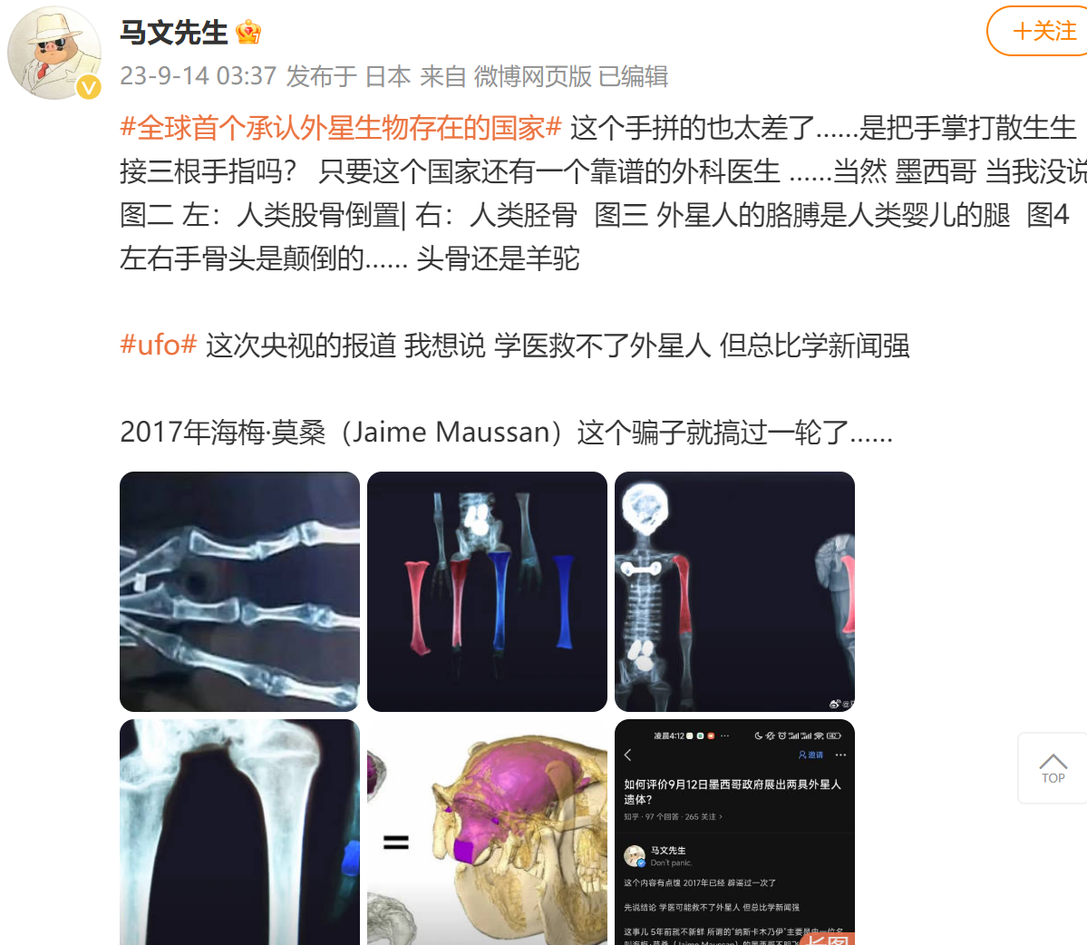 有博主也是第一时间发帖进行了反击,认为墨西哥这是在造假,拿不同骨头拼接来宣称外星人,实在是太差了。