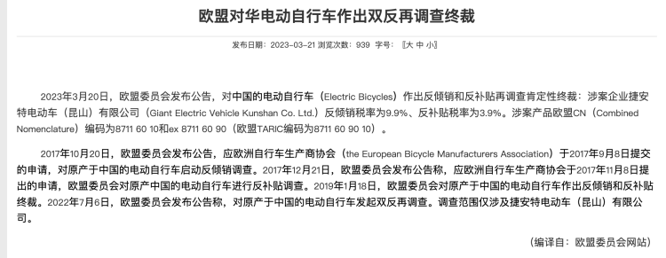 几年前,欧盟对出口至欧洲的中国品牌电动自行车发起了双反调查,从发起调查到终裁历时1年多,最终的裁决结果是增加反倾销税率为9.9%、反补贴税率为3.9%。