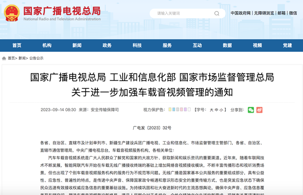 据国家广播电视总局官网消息,9月14日,国家广播电视总局、工业和信息化部、国家市场监督管理总局联合发布《关于进一步加强车载音视频管理的通知》。通知指出,近年来,随着车联网技术不断发展,智能网联汽车开始在车载无线广播接收终端的基础上增加网络音视频接收模块,不断丰富传播形态和视听消费场景,但也出现了个别车载音视频服务机构的服务行为不规范等问题。