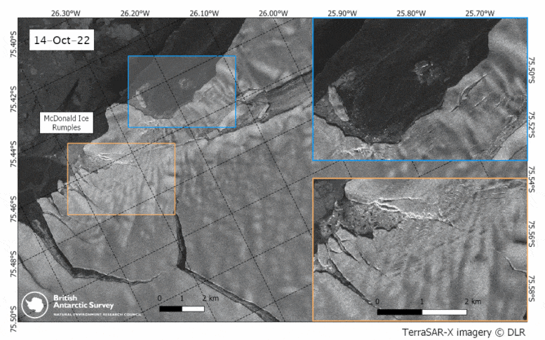 英国南极调查局(BAS)的科学家们正在利用部署在冰上的全球定位系统设备和卫星数据密切监测情况。资料来源:BASA