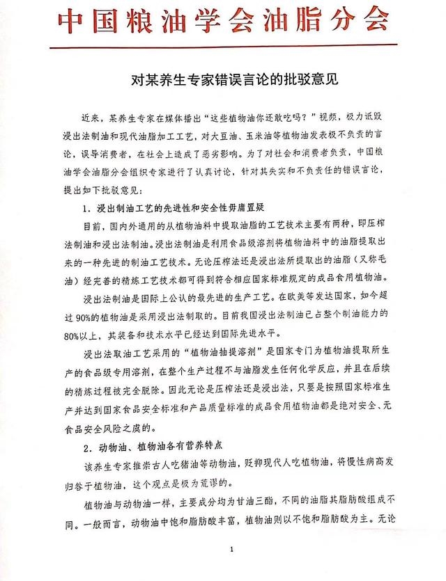 针对此事,中国粮油学会油脂分会进行了辟谣,对此错误言论发表批驳意见,官方称: