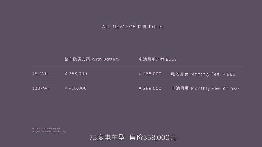 新一代蔚来EC6正式上市,该车可以视为是蔚来ES6的轿跑版,其价格要比ES6贵一些,共两款车型,整车购买方案售价分别为35.80万和41.60万;电池租赁方案两款配置售价均为28.80万,电池租用方案分别为980元/每月和1680元/每月。