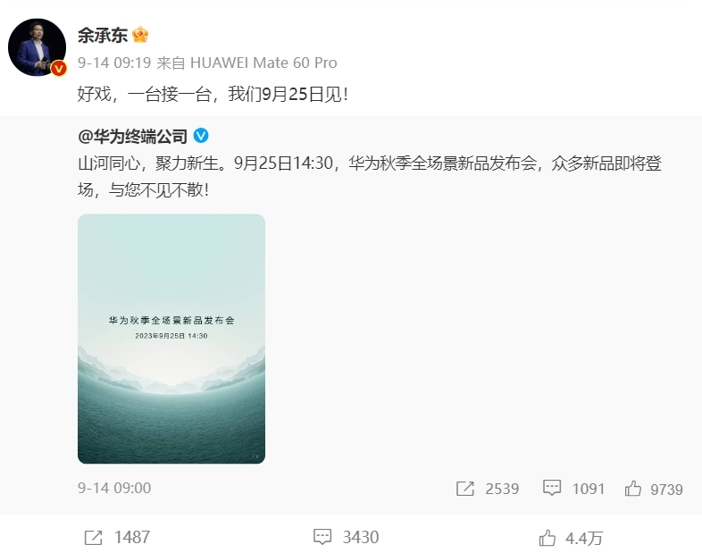 华为官方已经定于9月25日14:30举办秋季全场景新品发布会,届时众多新品即将登场。从此前余承东“好戏,一台接一台”的口吻来看,除了Mate 60系列之外,应该还有重磅新品将在发布会上揭晓。