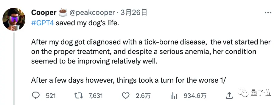 像是GPT-4出来后不久,就有人用它成功诊断了自家狗子的一种病例,这段经历一度在网上爆火。