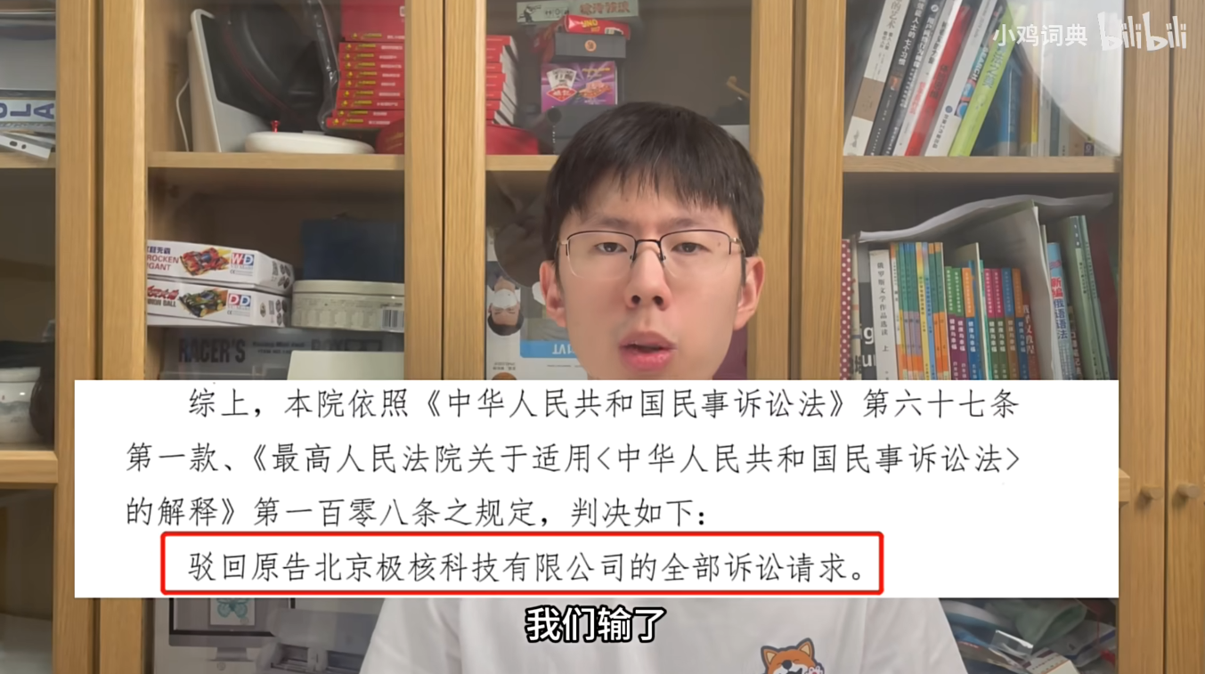 9月18日消息,日前,小鸡词典状告新浪微博“有梗百科”对其网站上内容涉嫌侵权一案已下达一审判决。判决驳回北京极核科技有限公司(以下简称“小鸡词典”)的全部上诉请求。小鸡词典B站官方账号发布最新视频,创始人黄宇帆称将继续上诉,并已将材料提交给二审法院,等待最终的判决,自称“希望渺茫”。
