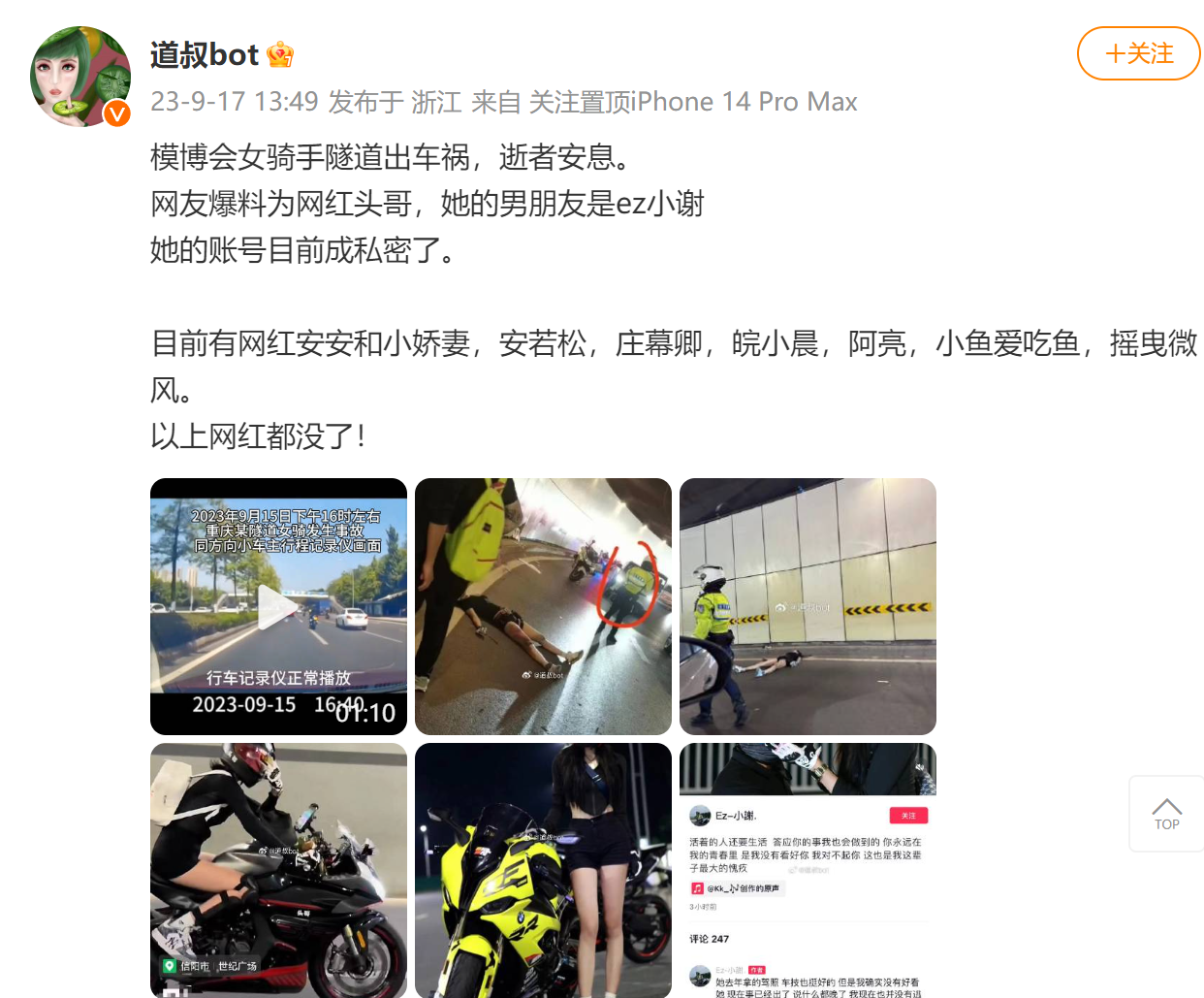 不知道从什么时候开始,摩托车开始在视频平台上跟流量挂钩了,不少人也因此丧命。9月18日消息,网友安安和小娇妻,安若松,庄幕卿,皖小晨,阿亮,小鱼爱吃鱼,摇曳微风等因为摩托车丧命还记忆犹新,现在机车网红圈传出噩耗,一位女网红去重庆参加摩博会时不幸发生车祸,年龄才20左右,目前曝光了车祸现场画面,十分惨烈。