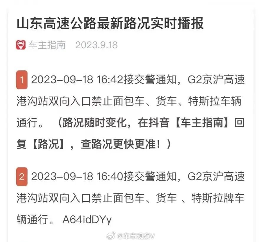 日前,网友上传照片显示,疑似沪陕高速山东段港沟站,禁止特斯拉车辆通行。另有媒体曝光的路况实时播报透露:接交警通知,G2沪陕高速港沟站双向入口禁止面包车、货车、特斯拉车辆通行,但原因并未公布。