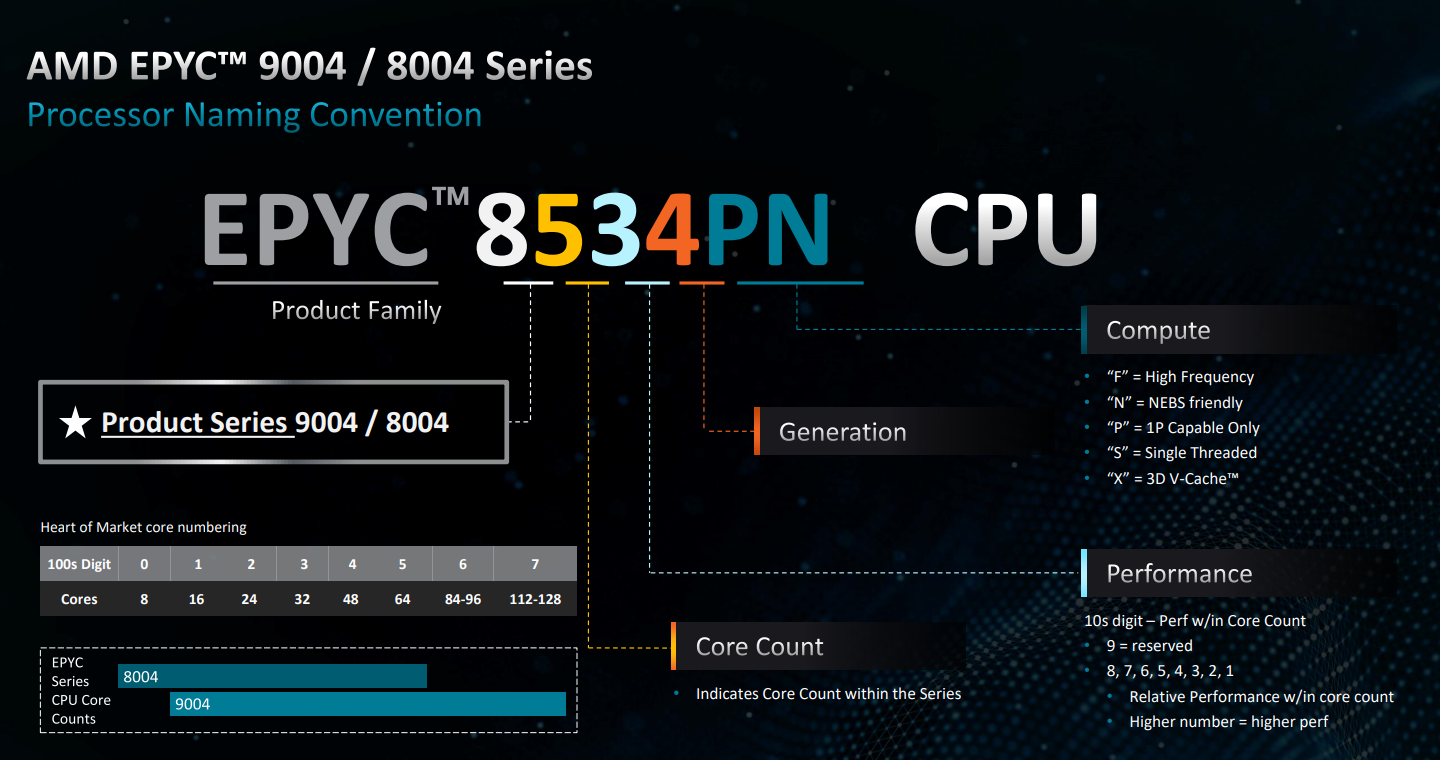 EPYC 8004系列型号众多,一共12款,因此有必要了解一下编号规则: