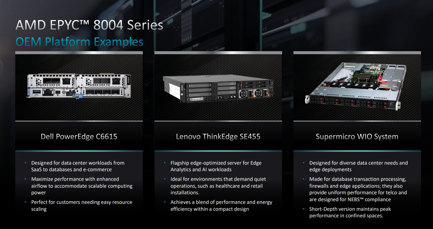 EPYC 8004系列主要面向零售、制造、电信等智能边缘应用,以及云服务、存储等数据中心应用,可以帮助客户打造高能效的差异化平台。