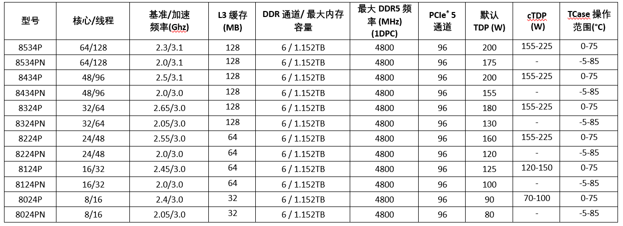 EPYC 8534PN频率降至2.0-3.1GHz,默认TDP 175W,温度范围-5℃至85℃。