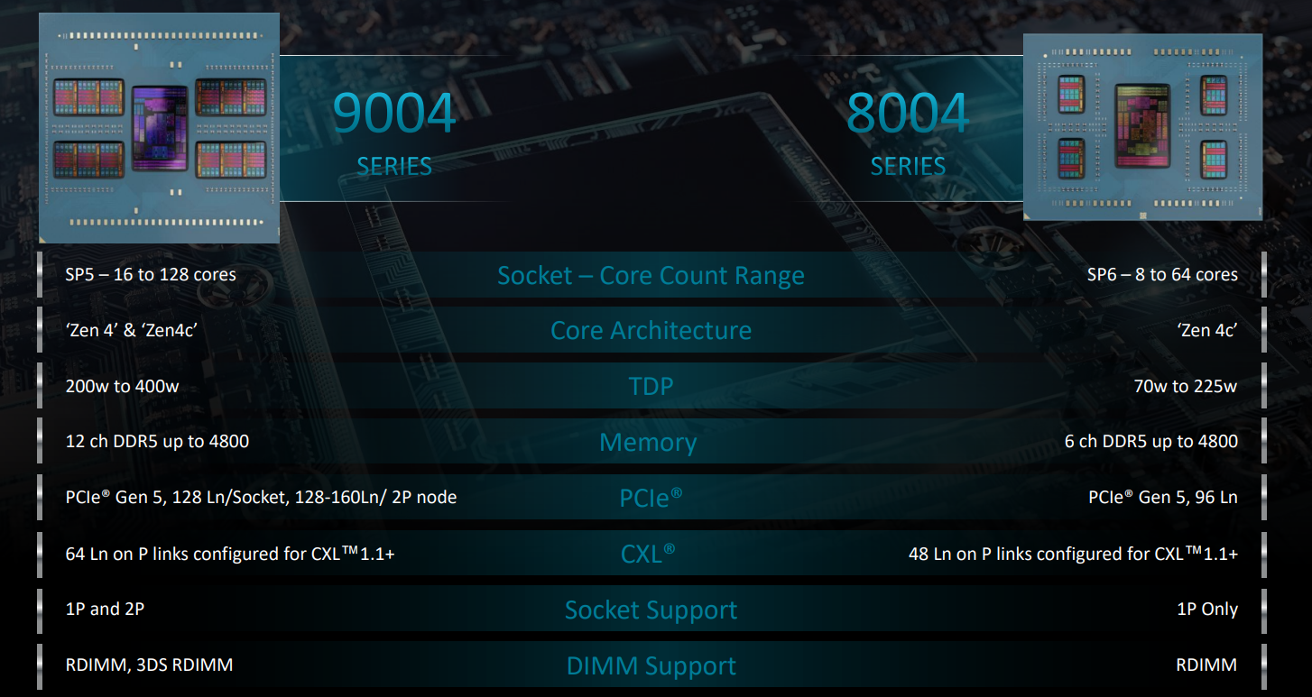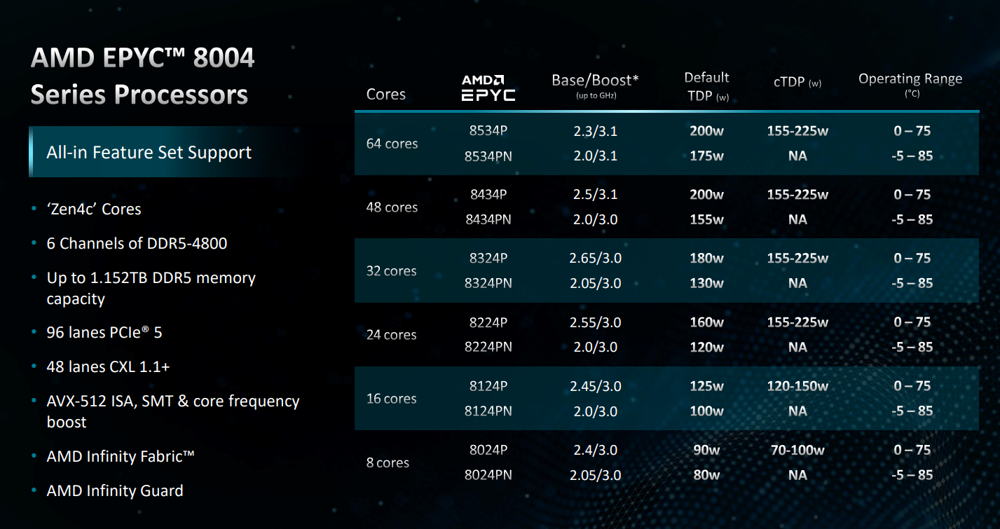EPYC 8004系列和EPYC 9X74系列一样都采用了特别设计的高能效Zen 4c架构,性能与能效更加平衡,系统设计也有相当大的灵活性。