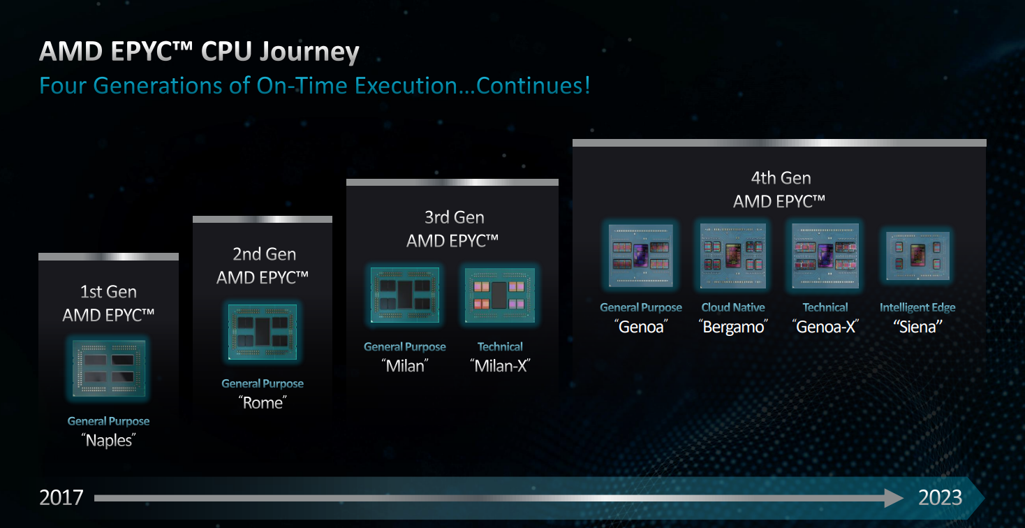 经过连续四代的演进迭代,AMD EPYC处理器越发强大,而且枝繁叶茂,Zen 4家族就分成了四个不同的子系列。首发的是EPYC 9004系列标准版(代号Genoa),适合通用计算,Zen 4架构,最多96核心192线程。