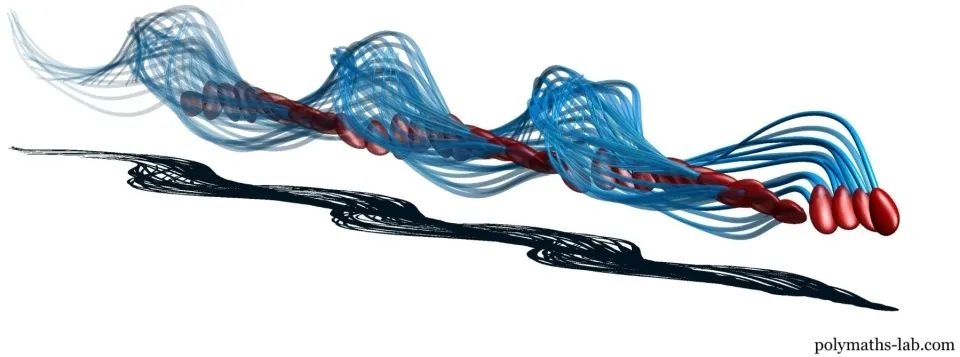 墨西哥国立自治大学的研究人员采用一个带有压电装置的3D显微镜,以及一台一秒钟能够记录超过55000帧的高速相机,3D扫描了自由游动的精子,然后以数学方法构建了精子的运动方式(如下图)[1]