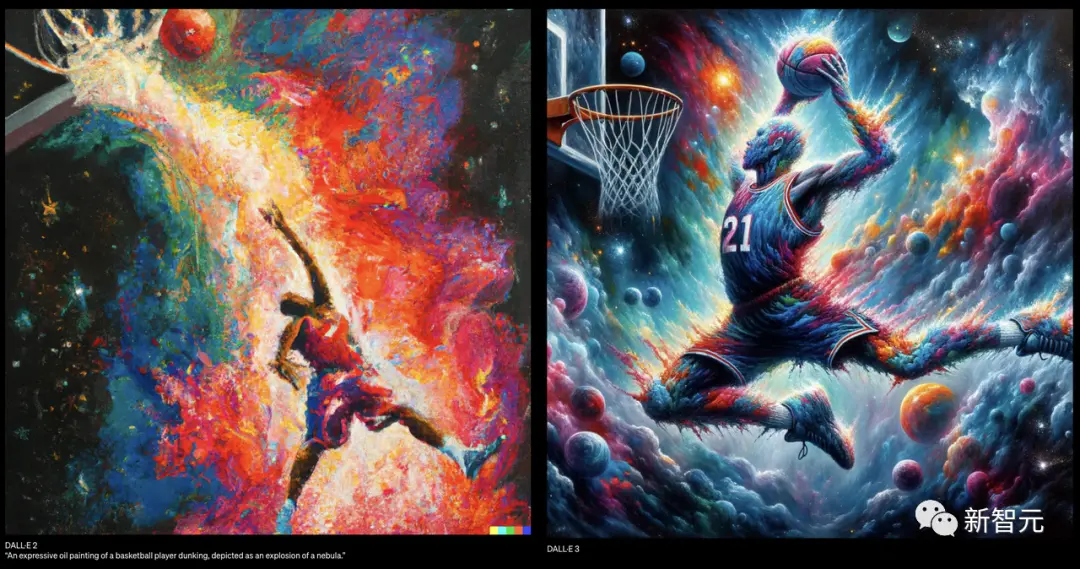 比如,“An expressive oil painting of a basketball player dunking, depicted as an explosion of a nebula”,DALL·E 3在人物、篮球、更宏观背景生成上更加详细。