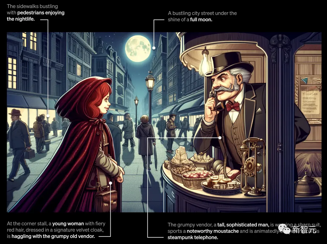 下面这个例子告诉你,DALL·E 3生成如下一幅画时,是如何详尽地将文字中的每一个场景,栩栩如生地刻在画中,画质仿佛电影一般。