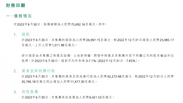 财报显示,部分借款由本集团之物业及设备、土地使用权、开发中物业及本集团内若干附属公司的股本权益作出抵押。于2023年6月30日,借款平均年利率为7.1%(2022年12月31日:7.65%)。