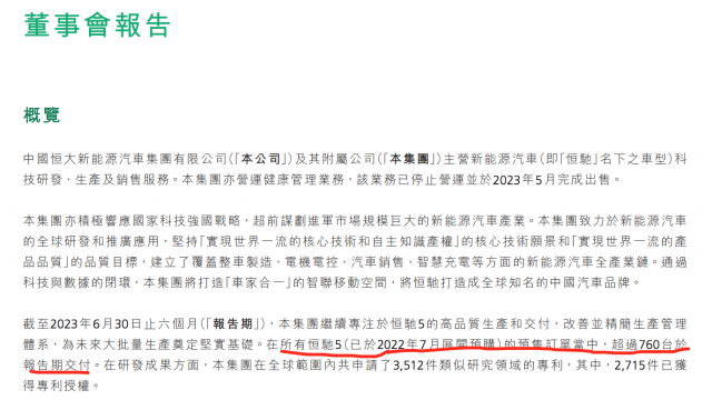2018年,恒大宣布“造车”。2022年7月,恒驰5展开预购。财报显示,在所有恒驰5的预售订单当中,超过760台于报告期交付。