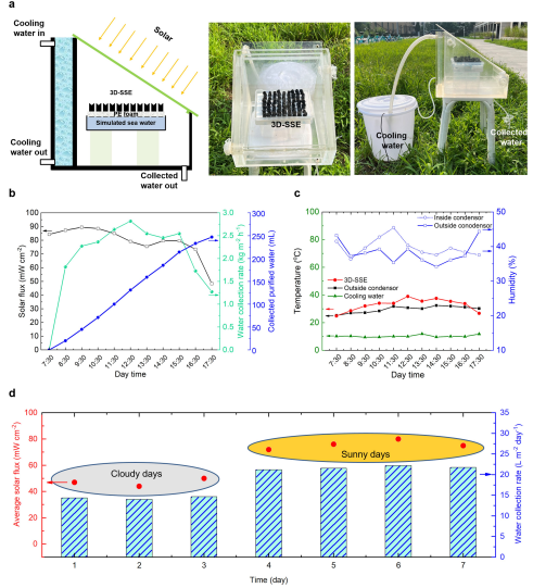 三维多孔连通结构蒸发器工作示意图(a.户外海水淡化装置;b.太阳光能量、淡水收集速率和收集淡水总量随时间变化;c.温度和湿度随时间的变化;d.日平均光通量和淡水收集速率)。图片来源:参考文献[1]