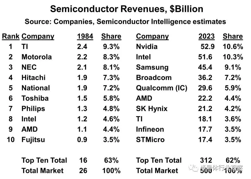 半导体行业的相对稳定性可以从1984年和2023年十大公司的市场份额看出。1984年TI的份额为9.3%。到 2023 年,英伟达将拥有约 10.6% 的份额。1984年前十名公司的市场份额合计为63%。2023年这一比例将达到62%左右。尽管顶级公司相对稳定,但该行业已从 1984 年的 260 亿美元增长到 2023 年的 5000 亿美元,几乎增长了 20 倍。