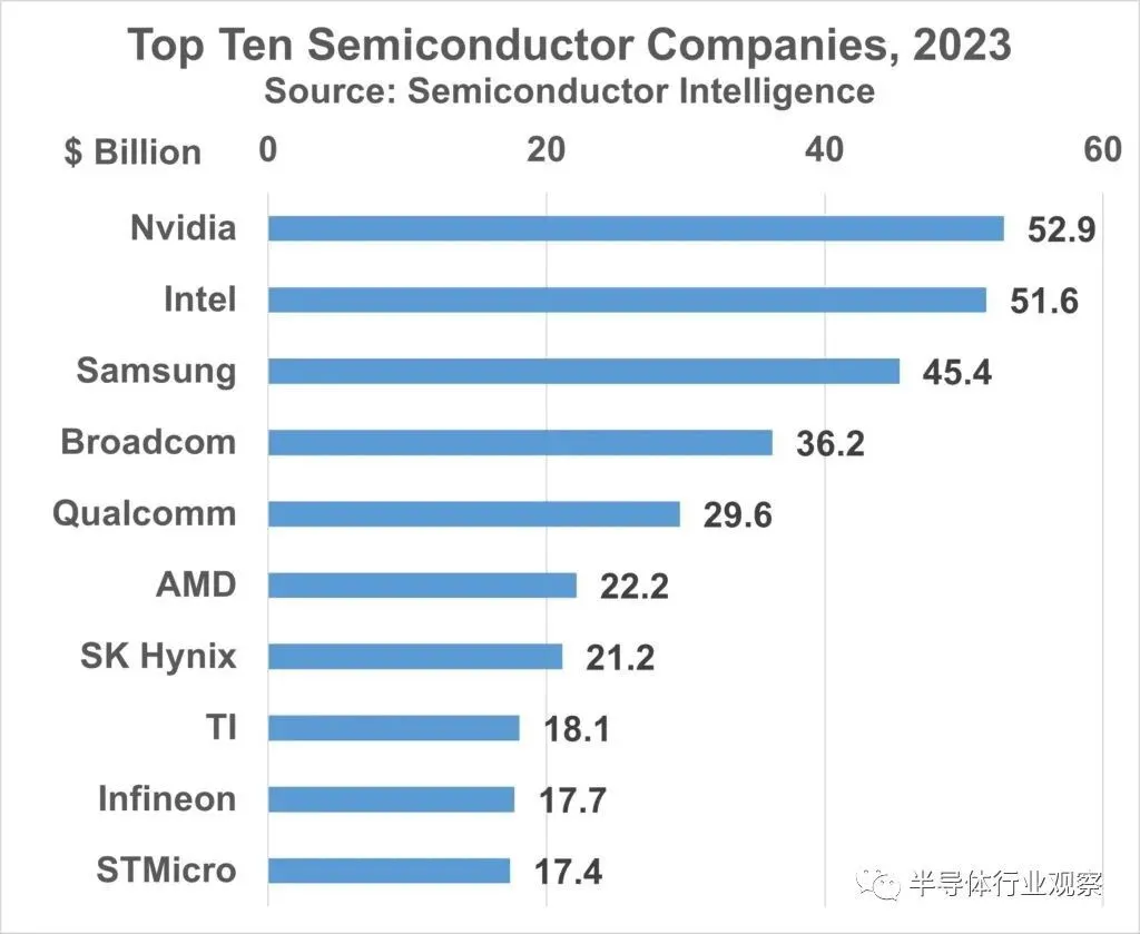 尽管半导体行业发展速度快,初创公司众多,但2023年排名前十的公司都已经经营了至少30年。