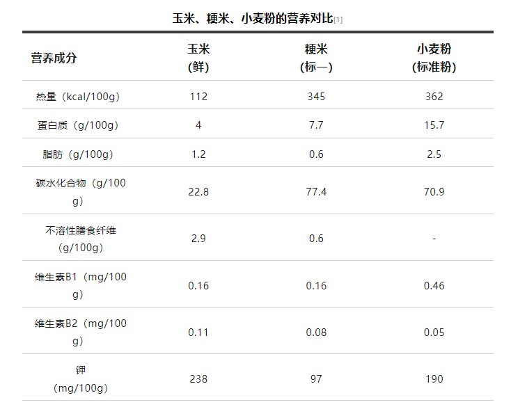矿物质钾:玉米的钾含量为 238mg/100g,[1]虽然比不上荞麦、燕麦、高粱米、藜麦、小米等全谷物,但也比我们常吃的精米白面优秀,分别是粳米和小麦粉的 2.5 倍、1.3 倍。
